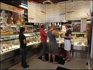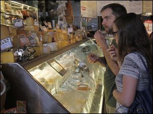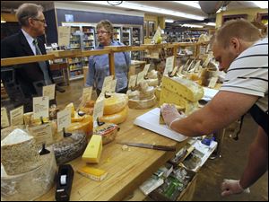 Customers Peter Price and Mary Kinley wait as John Mueller slices their cheese orders at Morgan & York wine and cheese store.