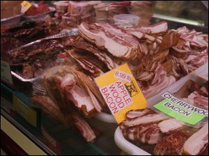 A variety of bacon for sale at the Sparrow Meat Market.