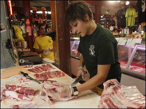 Mariam Maksutova cuts lamb breasts into spare ribs at Sparrow Meat Market in Ann Arbor.