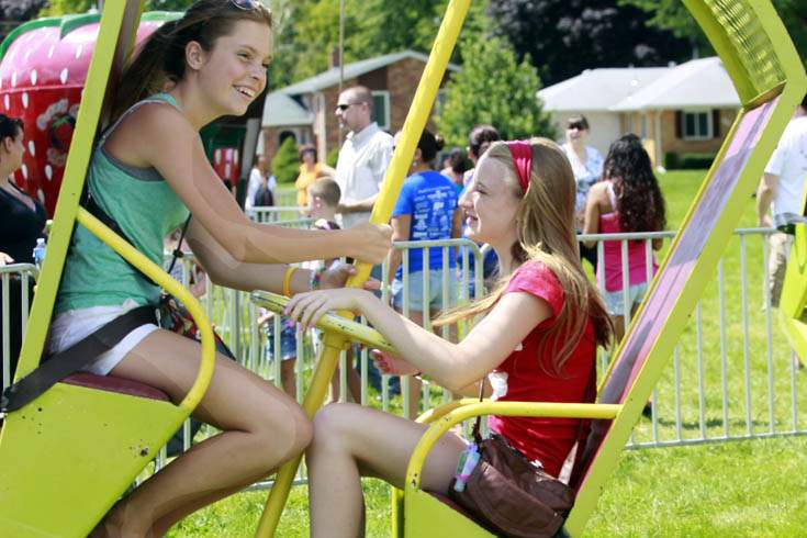 Julia Ehlert, 13, left, and Taylor Albain, right, 15, take a spin on a giant swing ride.