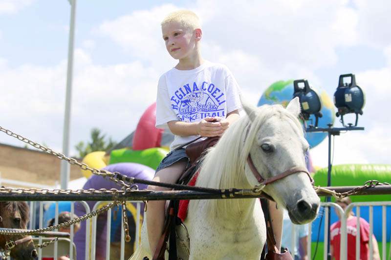 Brian Weaver holds his son Lucas Weaver, 3 from Toledo, on his shoulders while waiting in line to ride the ponies.