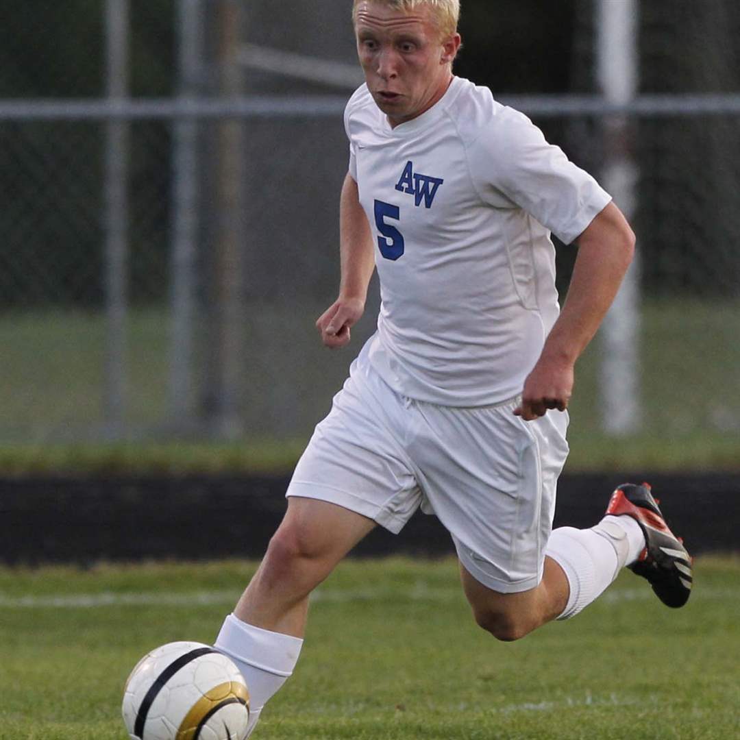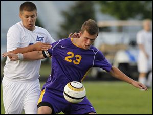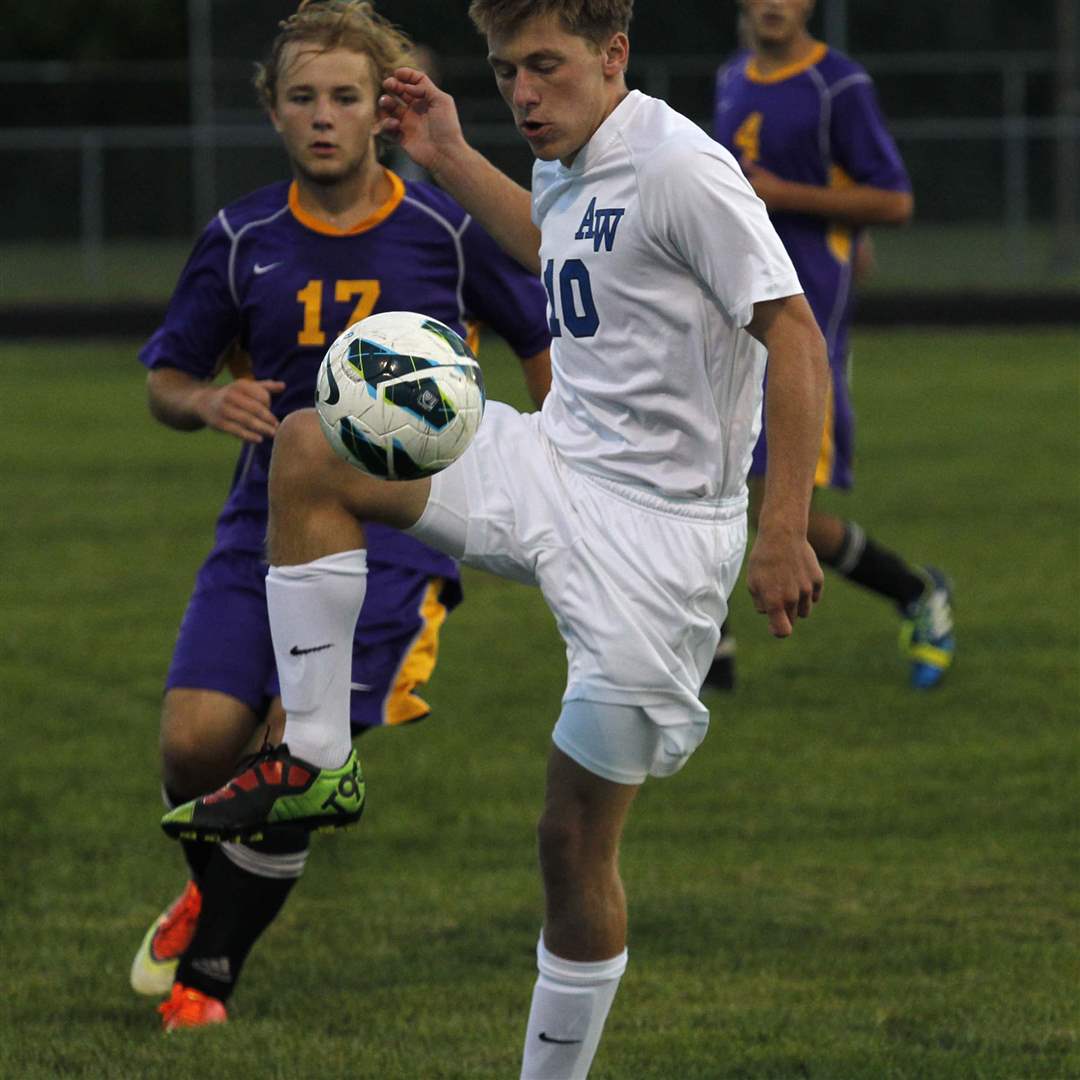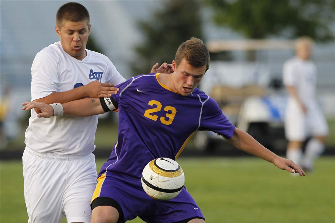 AW's JJ Fortner kicks the ball while being defended by Maumee's Andy Stead.