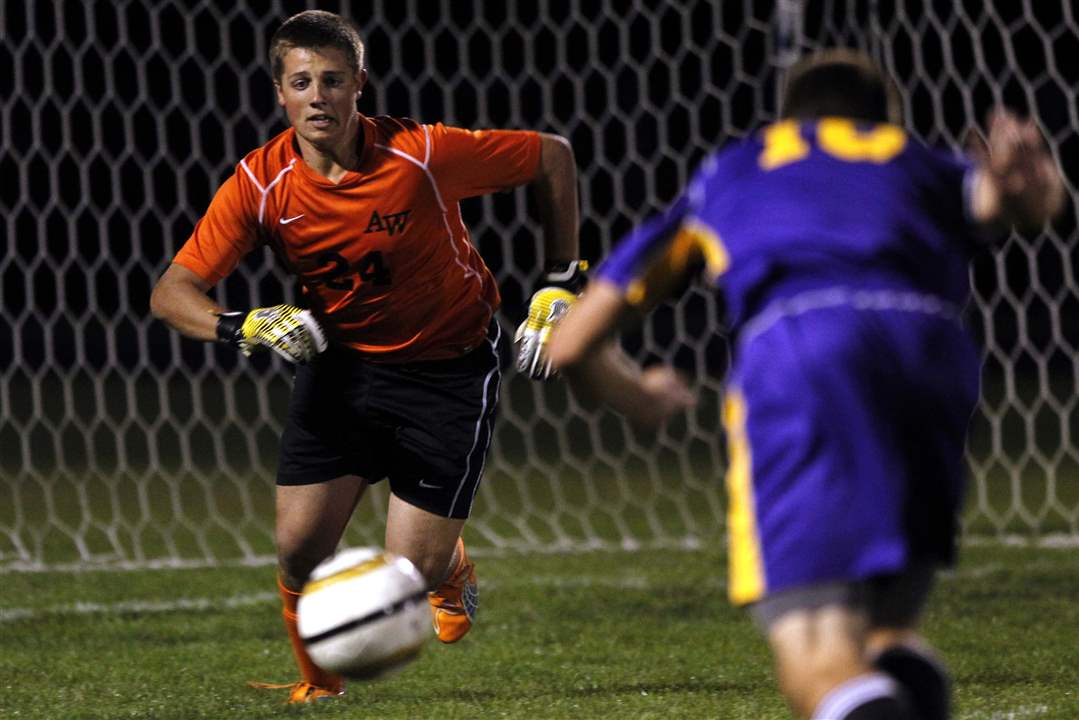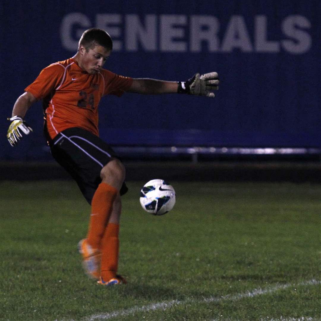 Anthony Wayne goalie Austin Kaminski kicks the ball.
