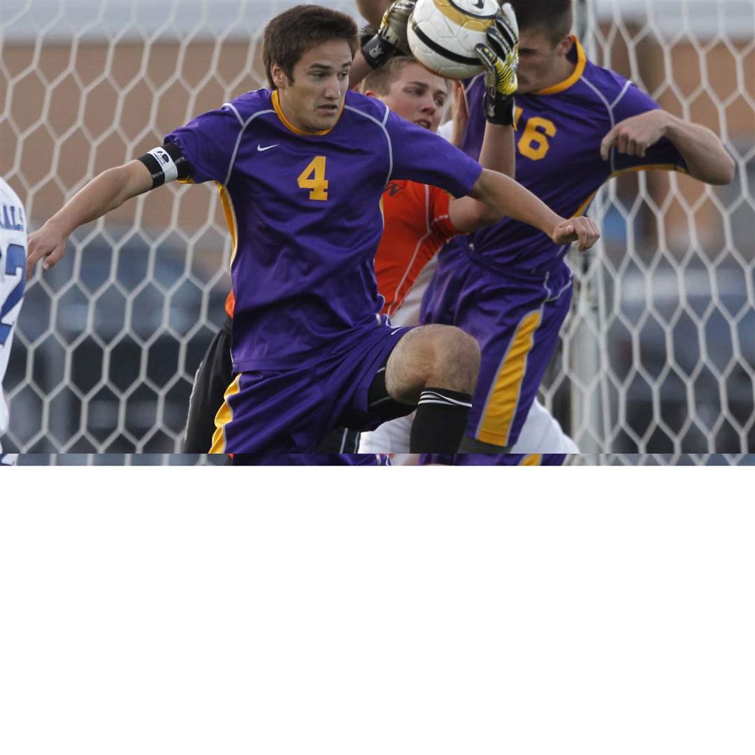 AW goalie Austin Kaminski runs to block a ball. On offense in foreground is Maumee's Jonathon Snell.