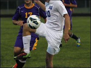 Maumee's KJ Mitchell watches AW's Zach Harris kick the ball during an NLL soccer game at Anthony Wayne High School in Whitehouse, Ohio.