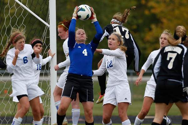 awpburgsoc27 Anthony Wayne keeper Taylor Hill pulls down the ball off a corner kick during the second half of the Saturday, Oct. 26, 2013, district championship game between Perrysburg and Anthony Wayne at Sylvania's Timberstone Jr. High. Anthony Wayne took home the championship, winning 1-0. THE BLADE/KATIE RAUSCH