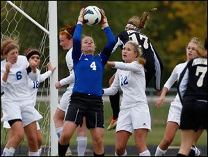 Perrysburg's keeper Sarah Baer (23) stops the ball during the second half.