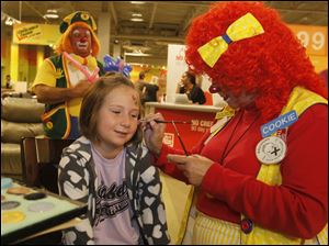 Hannah Theis, 8, of Toledo, has her face painted by Cookie the Clown, from Taylor, Michigan. Behind Theis is Wheelz, who is Todd Delo, of Lansing, Michigan.