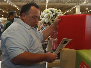 John Sayre, of Monclova, looking over the sale flyer and an ottoman in the color that would match a chair in which he had an interest.
