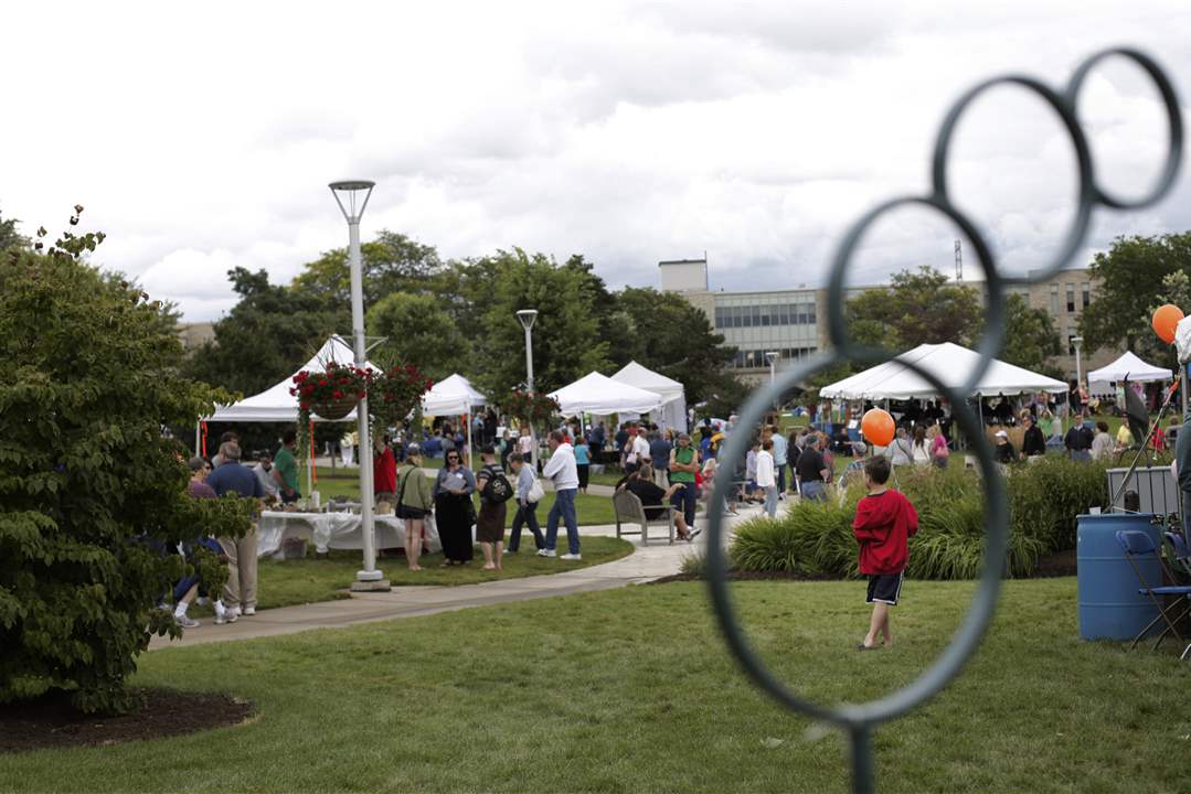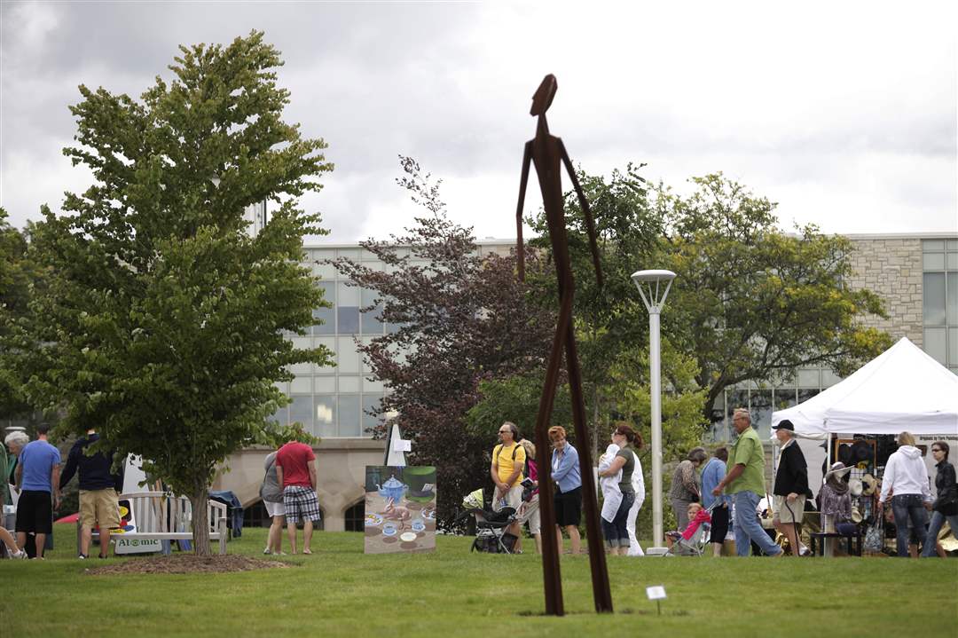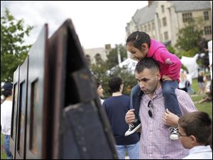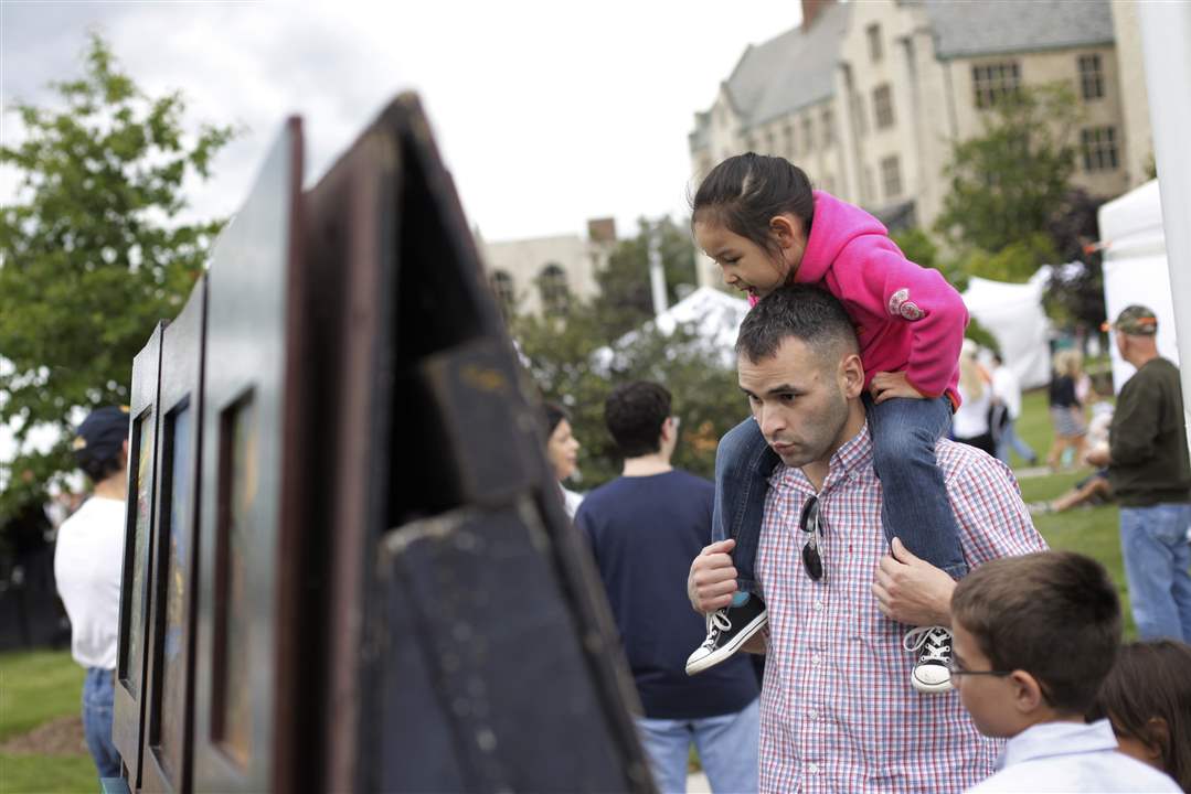 Maumee resident Kaleb Torres holds his daughter Vivianna, 4, on his shoulders as they look over pieces of art.