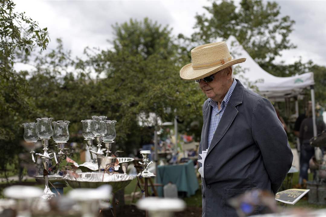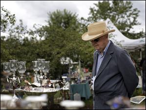 Lambertville resident Ray LeBlanc looks over pieces of art made from silver serving platters.