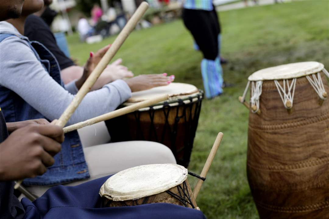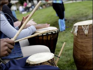 Toledo School for the Arts students Kyrha Benson, 16, left, Natalia Demigel, 16, and Jillian Highsmith, 17, perform a dance to the beat of a drum group.
