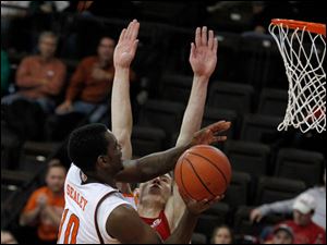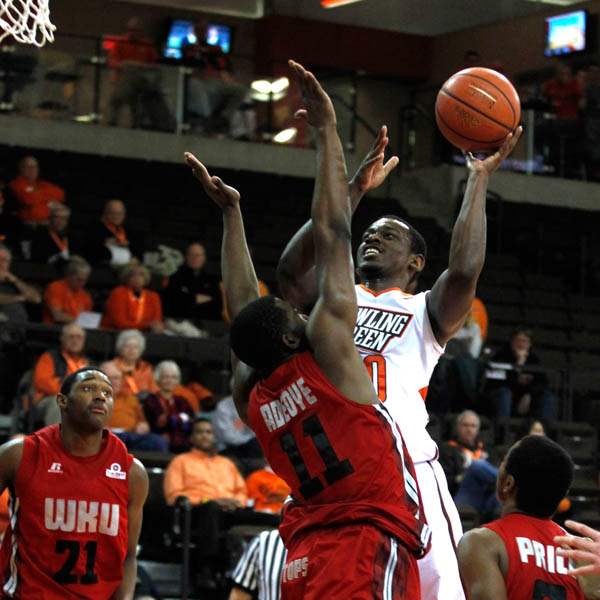 BGSU's Craig Sealey is guarded by Western Kentucky's Aleksej Rostov.