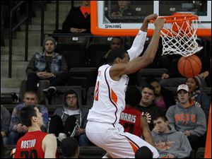 BGSU's Richaun Holmes dunks over Western Kentucky's Aaron Adeoye, 11, during 2nd half.