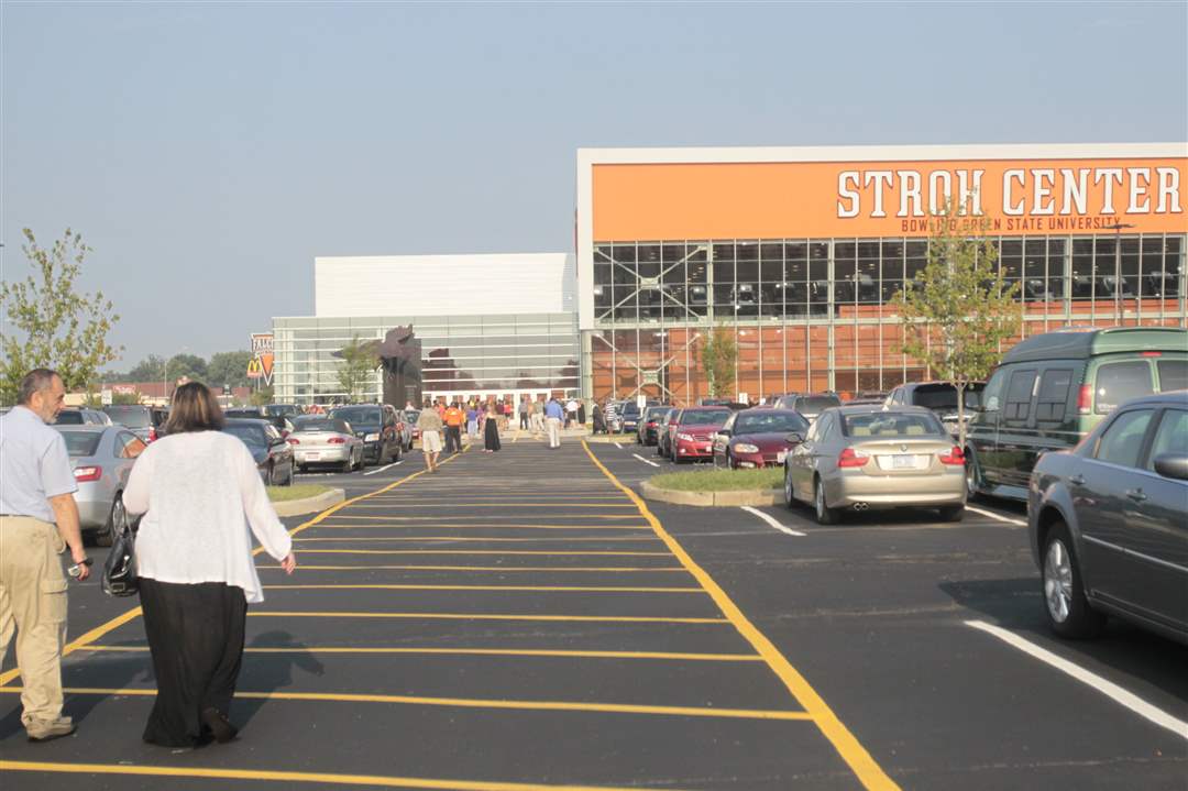 Family members walk towards the Stroh Center to attend Bowling Green State University' summer commencement on Saturday in Bowling Green.