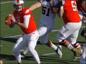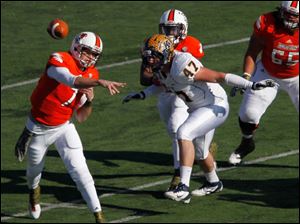 BGSU's Bart Tanski bobbles the ball for an incomplete pass near the end zone after pressure from Kent State's Norman Wolfe Jr.