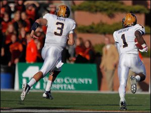 From left: Kent State's Luke Wollet with Norman Wolfe Jr. and Darius Polk celebrate what proved to be the game-winning touchdown.