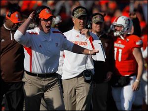 BGSU head coach Dave Clawson shakes hands with Alex Huettel after BGSU scored a touchdown.