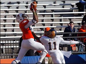 BGSU's Shaun Joplin goes up for touchdown catch over Kent State's Norman Wolfe Jr.