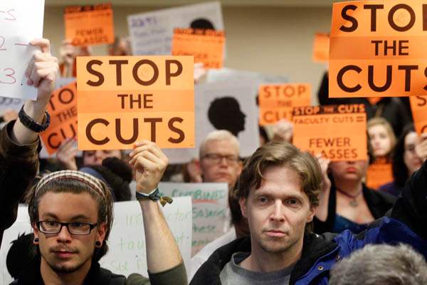 David Jackson, president of the BGSU Faculty Association, right, speaks with Art Brecher, left, a BGSU faculty member during a rally in the hallway.