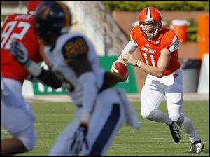 Bowling Green State University quarterback Matt Johnson (11) rolls out against Murray State during the second quarter.