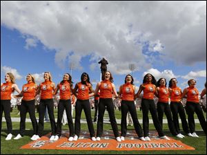 Bowling Green State University dance team members sing the alma mater before the Falcon football team plays Murray State.