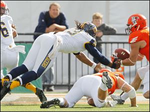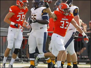 Bowling Green State University player Paul Swan (33) celebrates after recovering a Murray State fumble during the first quarter.