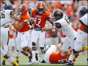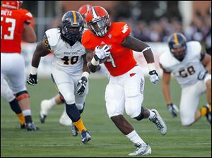 Bowling Green State University player Travis Greene (13) skips away from Murray State player Chavez Sims (7) for a touchdown during the second quarter.