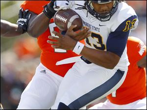 Bowling Green State University player Taylor Royster (51) sacks Murray State quarterback Maikhail Miller (13) during the first quarter.
