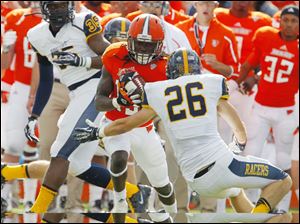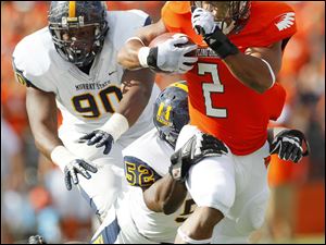 Bowling Green State University player Andre Givens (2) breaks free from Murray State players Demetrius Mason (90) and Sam Small (52) during the second quarter.