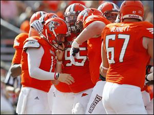 Bowling Green State University quarterback Matt Johnson (11) celebrates with teammates after scoring a touchdown during the second quarter.