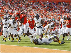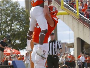 Bowling Green State University player Travis Greene (13) is hoisted in the air by teammate Alex Huettel (55) after scoring a touchdown.