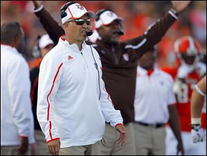 Bowling Green head coach Dave Clawson looks to the officials as a penalty is called against Murray State for a late hit on quarter back Matt Johnson (11) during the second quarter.
