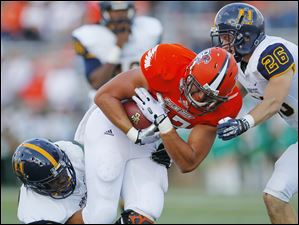 Bowling Green player Kevin Collins (82) is tackled by Murray State players Sam Small (52) and Demetric Johnson (26) during the second quarter.