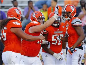 Bowling Green player Shaun Joplin (9) right, celebrates with teammates after scoring a touchdown during the second quarter.