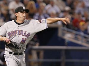 Buffalo pitcher Mike O'Connor makes a throw to first base against Toledo during the fifth inning.