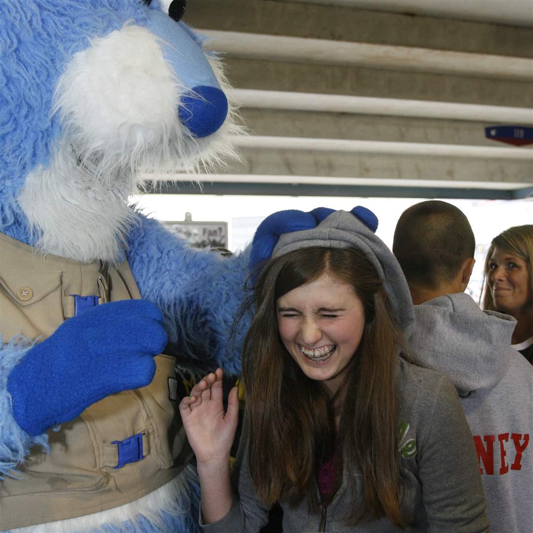 Toledo Walleye mascot Cat Trick, left, plays with Brooke Crawford, 12, of Temperance Road Elementary School of Bedford, Michigan.