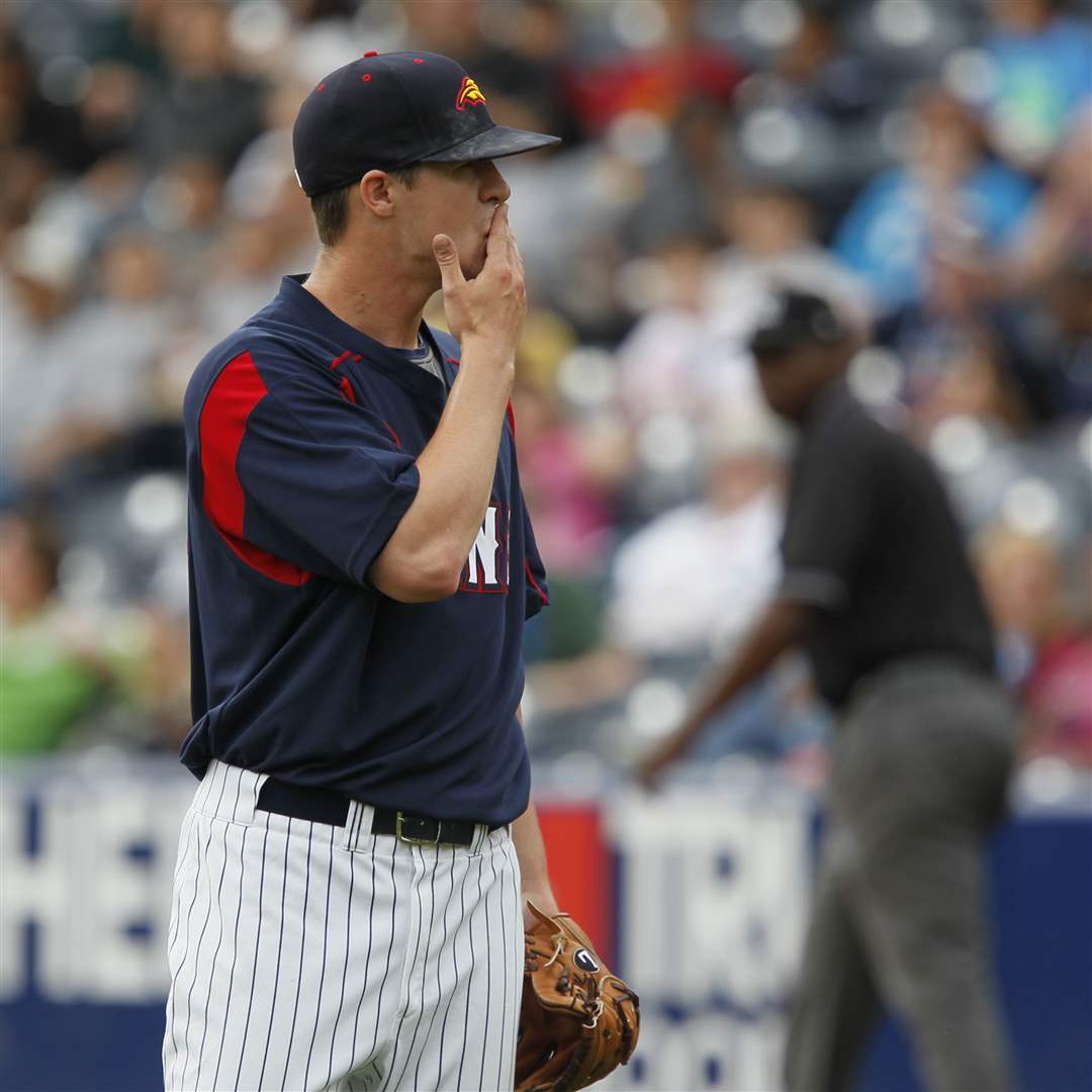 Mud Hens starting pitcher Thad Weber reacts to giving up a first-inning, two-run home run to the Durham Bulls' Brandon Guyer.