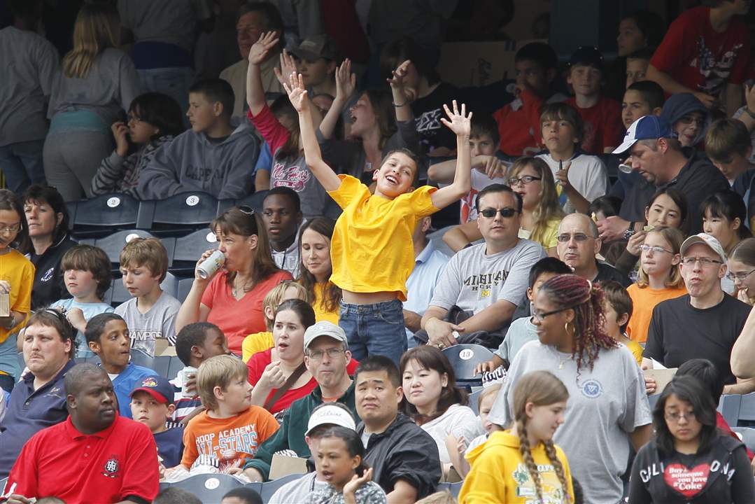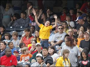 Alejandro Derieux-Cerezo, 10, of Ann Arbor, gets excited at the Mud Hens game during Michigan's Lawton Elementary School final School Celebration Day.