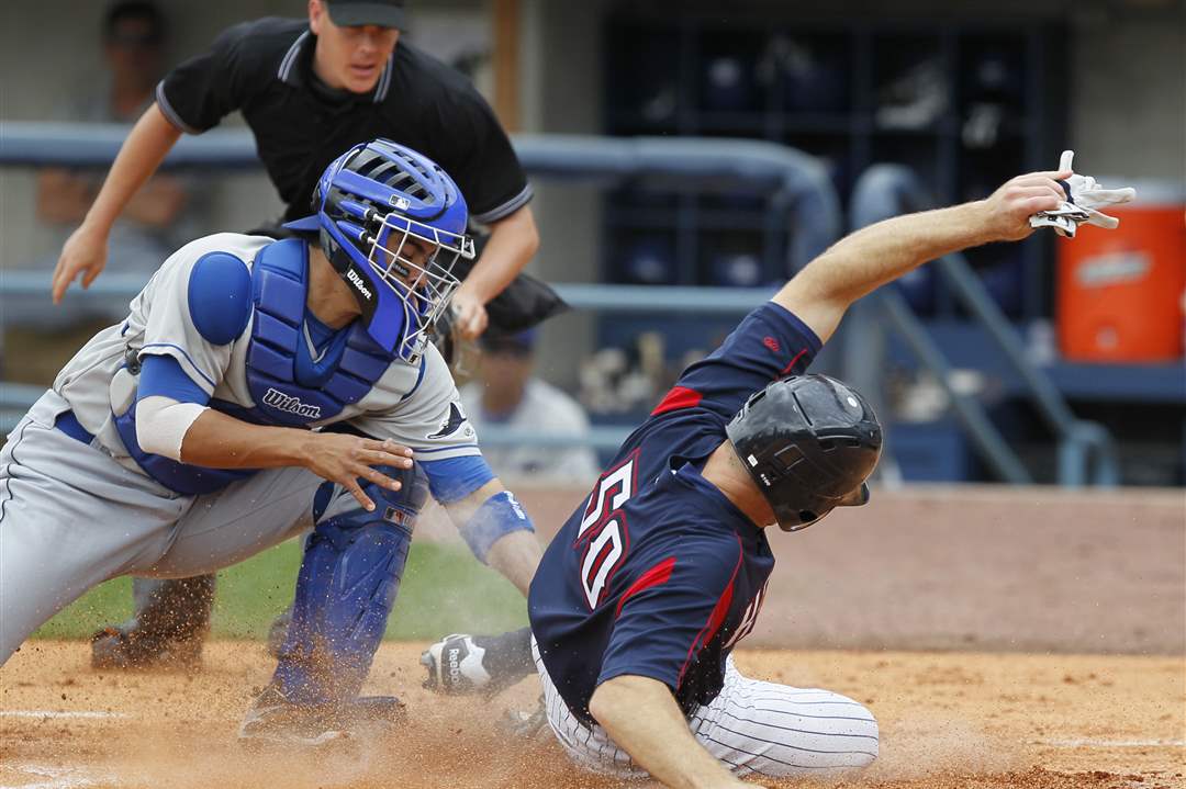 Scott Thorman is tagged out at home by Durham Bulls catcher Robinson Chirinos in the first inning. The home plate umpire is Jon Byrne.