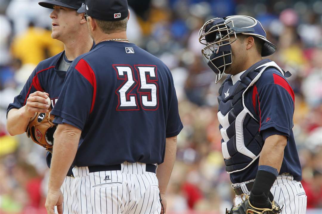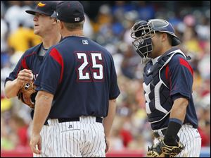 Toledo pitcher Thad Weber is pulled by Hens manager Phil Nevin. At right is catcher Omir Santos.