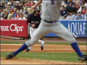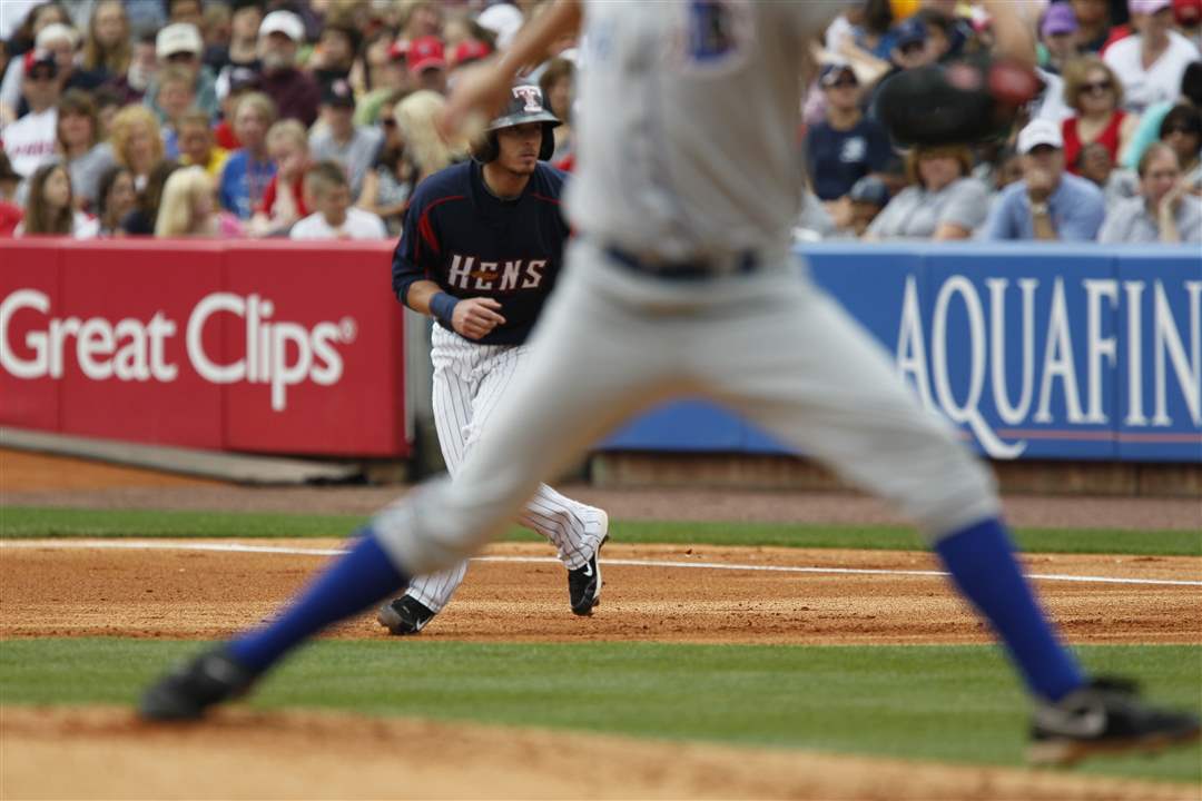 Mud Hens' Will Rhymes takes a lead from first base against Bulls pitcher Brian Baker in the first inning. Rhymes stole second and then scored on a single by Ryan Strieby.