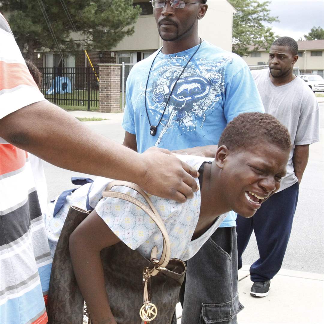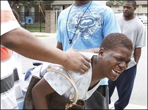 Tamatha Hamilton, center, an aunt to the children who were shot at the Moody Manor, cries while being comforted by her husband Miguel Hamilton, right, outside of the residences on August 10, 2012.