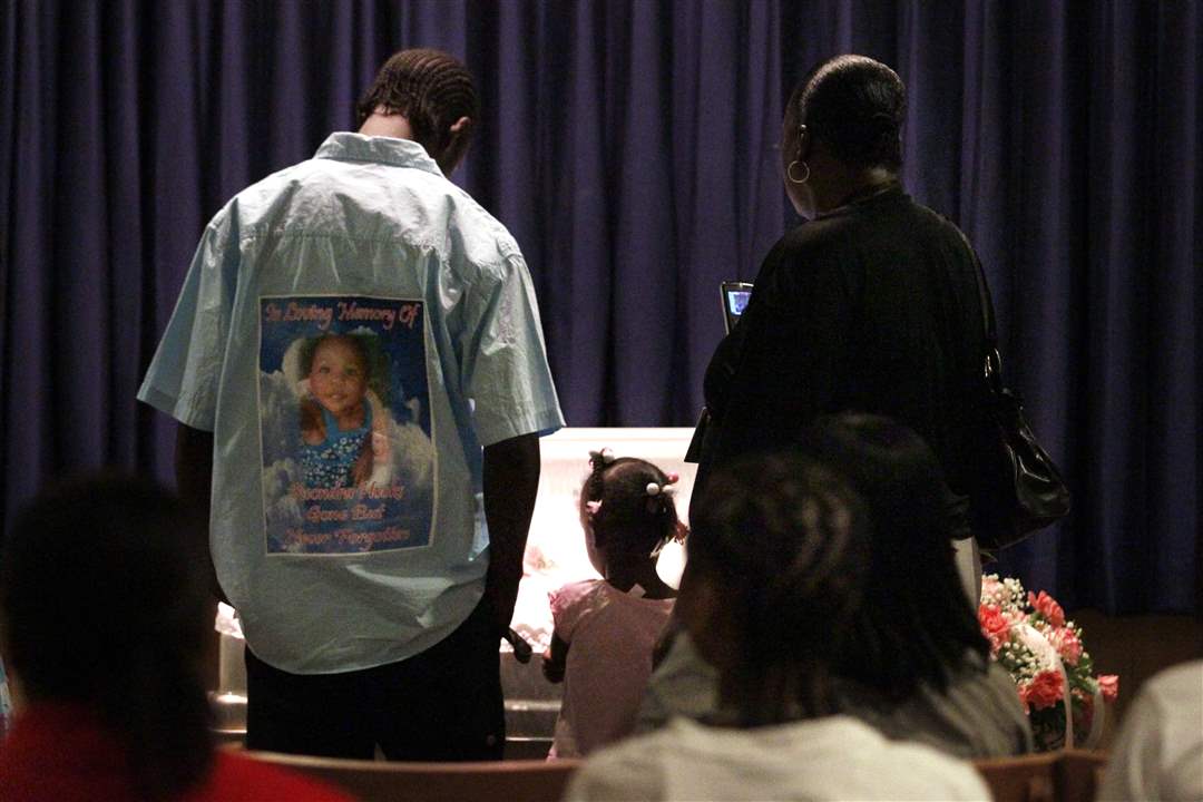 A photo of Keondra Hooks, 1, is on the back of a mourner during the funeral for the little girl at Tate Funeral Service, Thursday, August 16, 2012. Keondra died after being shot inside Moody Manor.