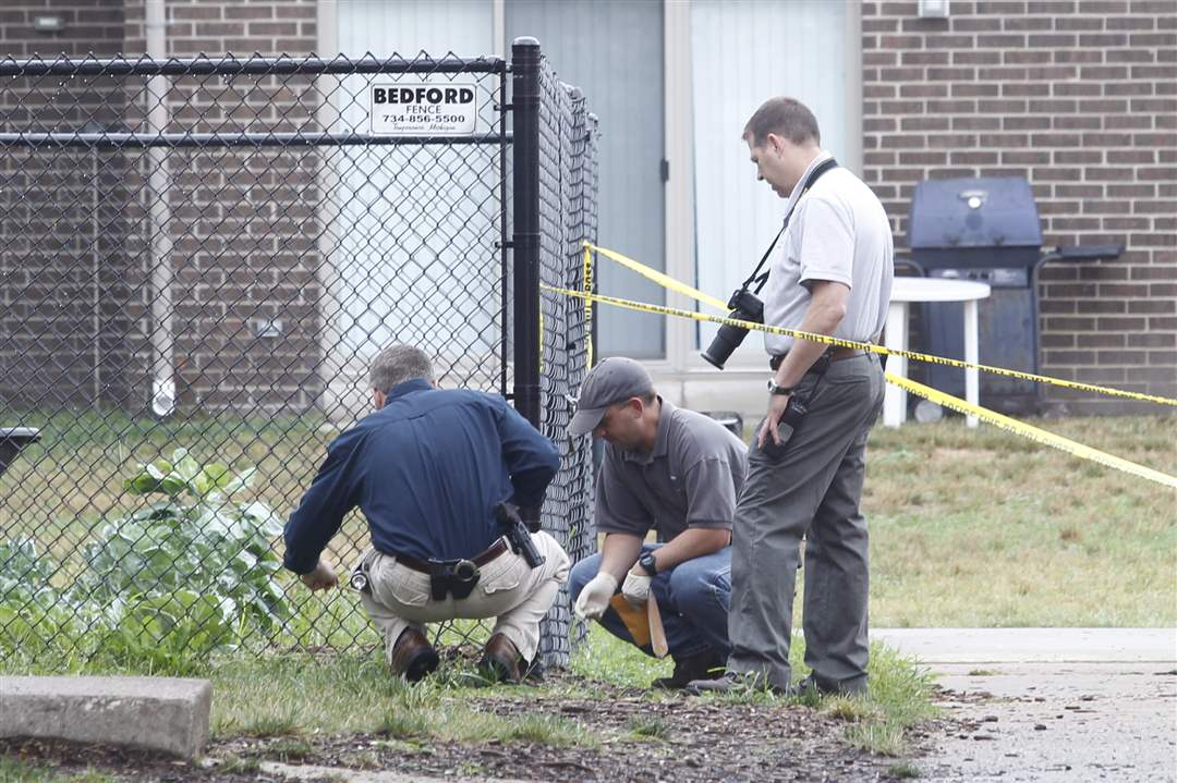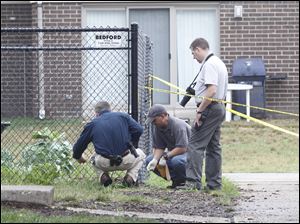 Authorities search the area around 2225 Kent where two children Leondra Hooks, 2, and Keondra Hooks, 1, were shot.