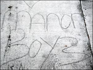 A gang tag for the Manor Boys etched in the cement outside of the Moody Manor area around Delaware.