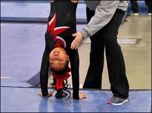 Toledo Turners gymnast Genevieve Thomas is assisted on her handstand by coach Kristin McGee during the Battle of Champions event at the SeaGate Convention Center in Toledo.