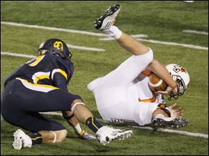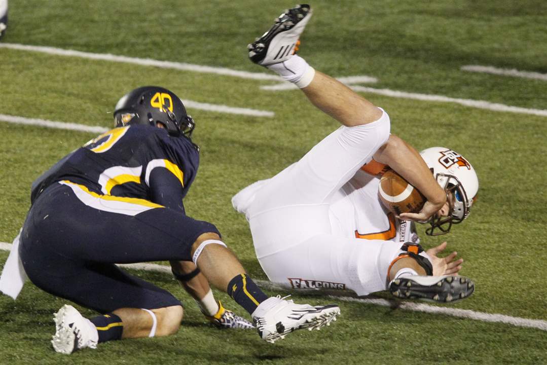 Bowling Green quarterback Matt Schilz is sacked by Toledo linebacker Trent Voss during the second quarter of their football game at the Glass Bowl in Toledo.