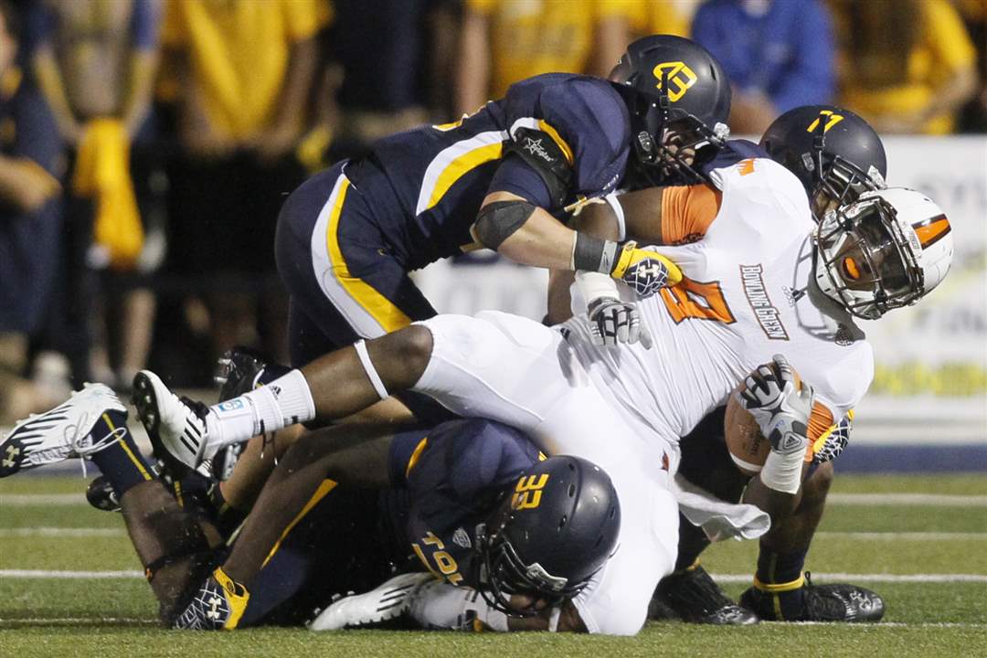 Bowling Green receiver Shaun Joplin is brought down by Toledo defenders Junior Sylvestre, 33, Mark Singer, 43, and Cheatham Norrils, 11, during the second quarter of their football game at the Glass Bowl in Toledo.