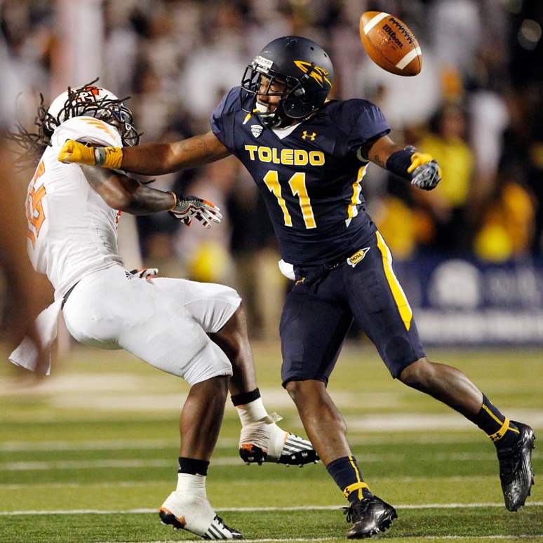Toledo defensive back Cheatham Norrils, 11, left, intercepts a pass intended for Bowling Green receiver Chris Gallon, 81, during the second quarter of their football game at the Glass Bowl in Toledo.